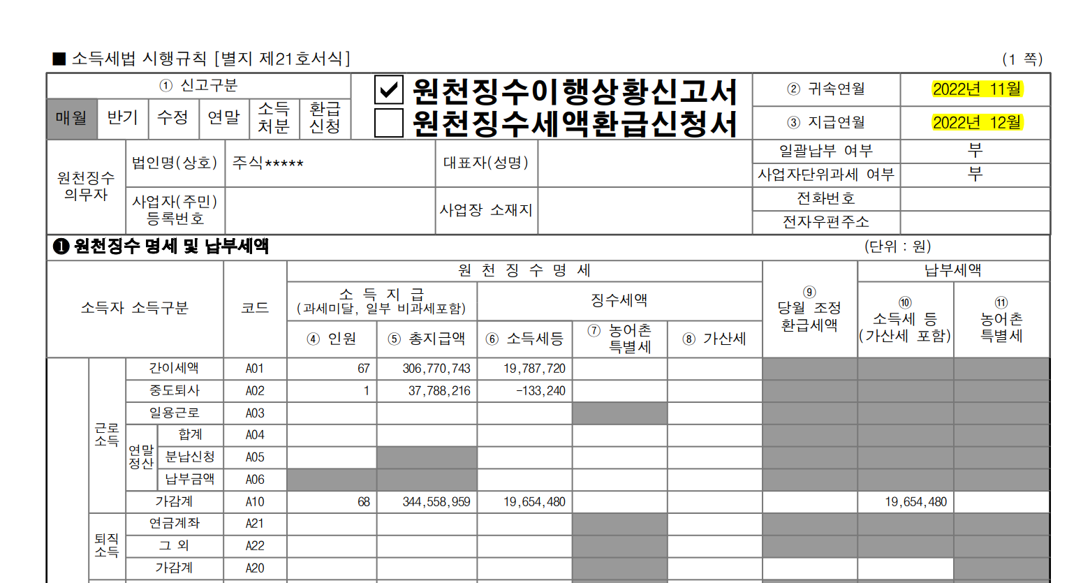 | >>> 귀속연월과 지급연월 차이가 1개월이면 예수금 2개월치(12월,11월) 계상, 귀속연월과 지급연월이 같다면 예수금 1달치(12월) 계상 | ||||||||