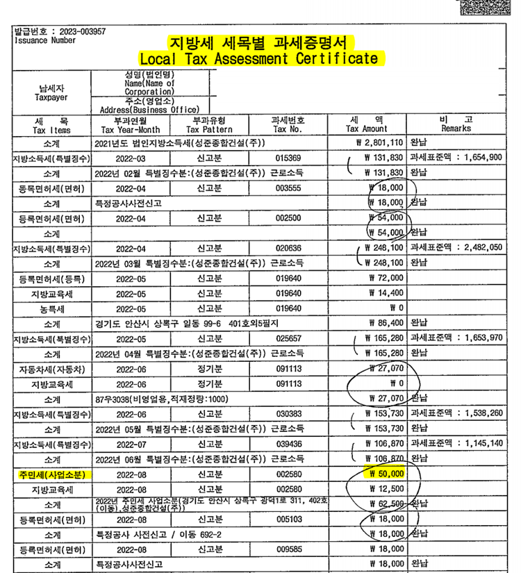 '지방세 과목별 과세증명서' - 예수금(주민세 및 기타지방세) 검증