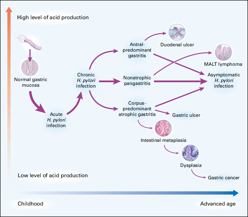헬리코박터균에 감염되면 먼저 급성 헬리코박터 위염을 일으키며 어느정도 회복되더라도 대부분 만성 위염으로 진행하여 위궤양, 십이지장궤양, 위선암, MALT lymphoma 등을 일으킨다.