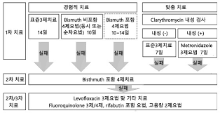 - 4제치료 : PPI(BID) + Bismuth(120mg, QID) + Metronidazole(500mg, TID) + Tetracycline(500mg, QID) 7~10일
