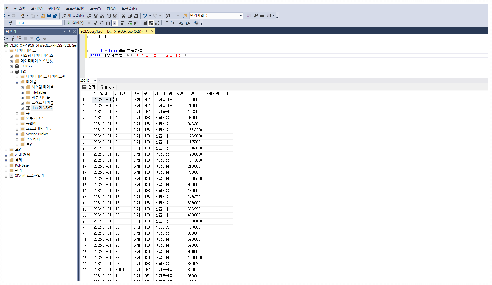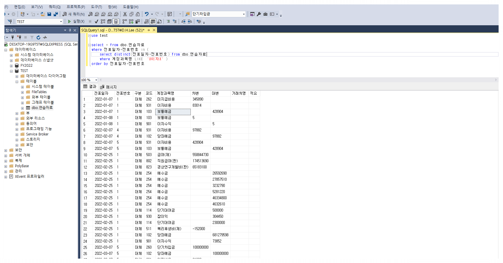 --> 만약 where 계정과목명 like '이자%' 라고 적용하면 다음과 같은 예가 있을 수 있음 "이자비용", "이자수익"