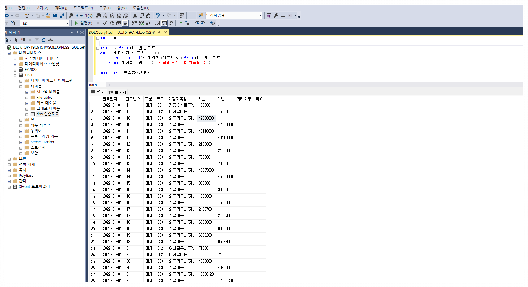 위에서는 1) "계정과목명"이 "선급비용" 또는 "미지급비용"인 자료를 호출했는데, 이는 그냥 엑셀로 필터걸어서 선택하면 그만임. 만약 여기서 2) "계정과목명"이 "선급비용" 또는 "미지급비용"이 포함된 전표의 전체 분개를 보고 싶으면?