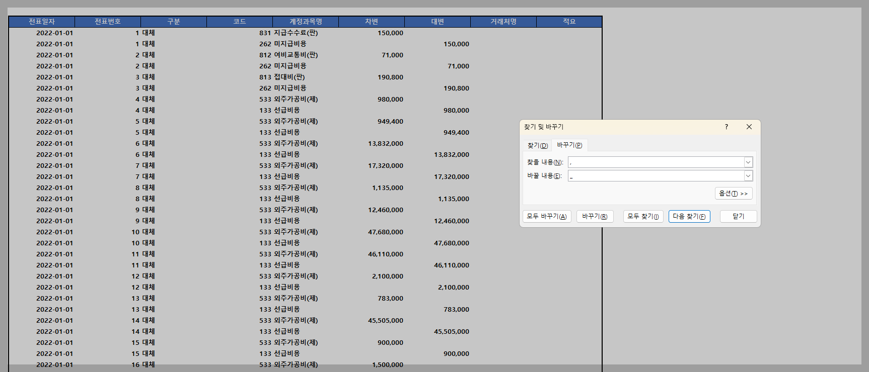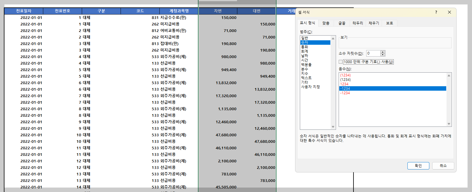 나만의 팁을 제공하자면 아래의 차변, 대변열은 ctrl+1 서식란에서 (숫자 > -1234 > 구분자사용x) 순으로 우선 숫자들에서 천단위 구분자를 제거하고, 그외 적요란에 대해서는 두번째 사진처럼 전체선택하여 ","를 "_"(under bar)로 일괄변경해줌.